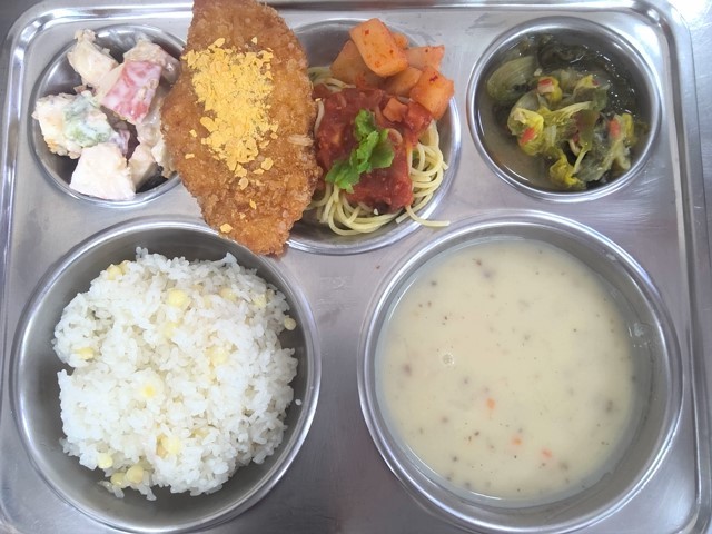 옥수수밥양송이크림스프(2.5.6.13.16)김치스파게티(부)(1.2.5.6.9.10.12.13.15.16)과일요거트샐러드(1.2.4.5)대만식 지파이(1.5.6.15.18)깍두기(9)단배추조림(자율)(5.6)