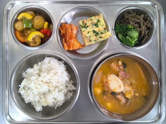 보리밥 부대찌개 (1.2.5.6.9.10.13.15.16.)매콤무항생제달걀찜 (1.2.9.)이색나물(단배추/고사리) (5.6.)동글찹쌀탕수육 (2.5.6.10.13.16.)배추김치 (9.)