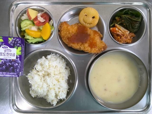 기장밥 양송이크림스프 (2.5.6.13.16.)깻잎지(자율) (5.6.13.)생치킨커틀렛 (1.5.6.12.13.15.18.)배추김치 (9.)포도주스(120) (13.)양상추복숭아샐러드 (5.6.11.12.)