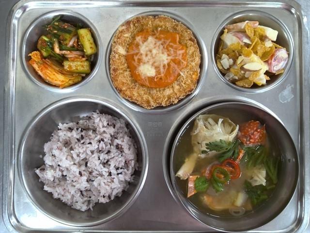 검정찹쌀밥 꽃게된장국 (5.6.8.9.13.)과일샐러드&요쿠르트소스 (1.2.5.6.11.12.13.)눈꽃로제포크커틀렛 (1.2.5.6.10.11.12.13.16.)배추김치 (9.)오이부추무침
