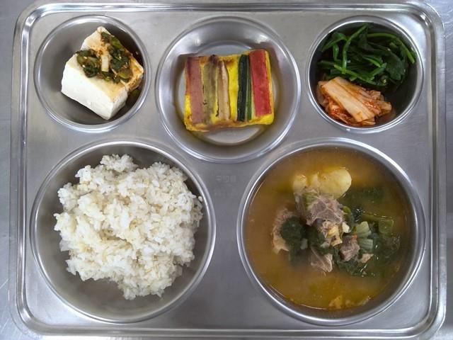 보리밥 등뼈감자탕 (5.6.9.10.13.18.)온두부양념장 (5.6.13.)시금치나물(자율) (5.6.)오색산적구이 (1.5.6.10.15.16.)배추김치 (9.)바나나 (13.)