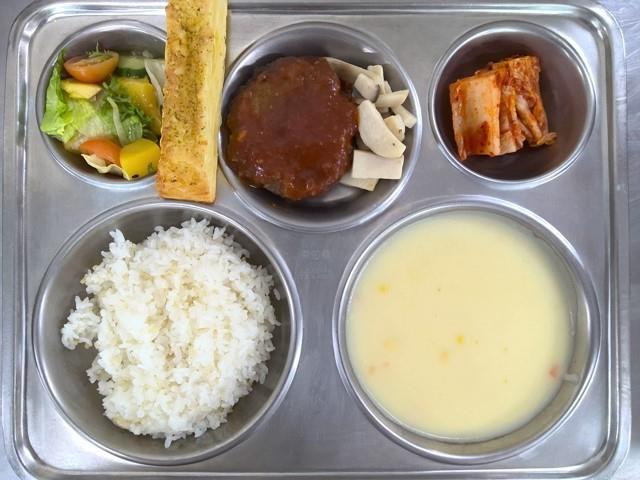 현미찹쌀밥 콘크림스프 (2.5.6.13.16.)그릴함박스테이크&새송이버터구 (1.2.5.6.10.12.13.15.16.18.)배추김치 (9.)마늘파이 (2.5.6.)양상추복숭아샐러드 (5.6.11.12.)