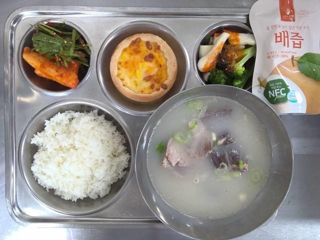 쌀밥 돼지사골순대국 (2.5.6.9.10.13.16.)부추겉절이 (5.6.13.)새송이브로콜리초고추장 (5.6.13.)총각김치 (9.)시카고피자 (1.2.5.6.10.12.15.16.18.)따뜻한배즙 (13.)