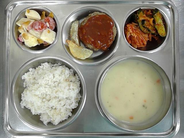 보리밥 양송이크림스프 (2.5.6.13.16.)도라지오이초무침 (5.6.13.)과일샐러드&요쿠르트소스 (1.2.5.6.11.12.13.)정통함박스테이크&웨지감자 (1.2.5.6.10.12.13.15.16.18.)배추김치 (9.)