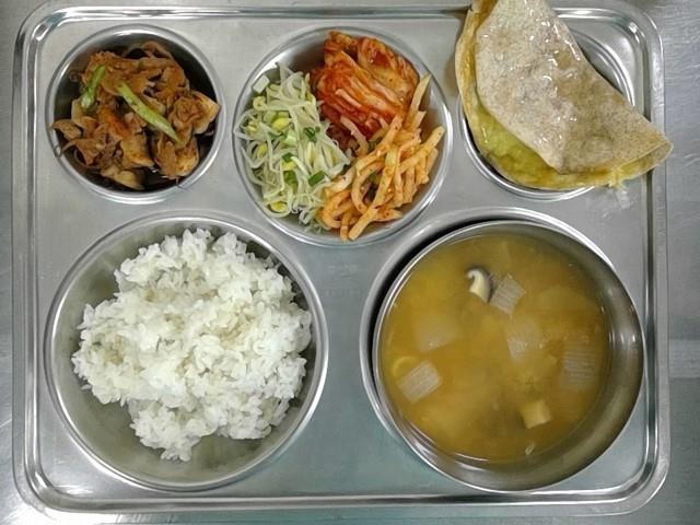 발아현미밥 두부된장국 (5.6.18.)무생채(레드) (13.)콩나물무침(화이트) (5.)매콤숯불주꾸미볶음 (5.6.10.13.)배추김치 (9.)수제고르곤졸라피자&꿀小 (2.5.6.12.13.)