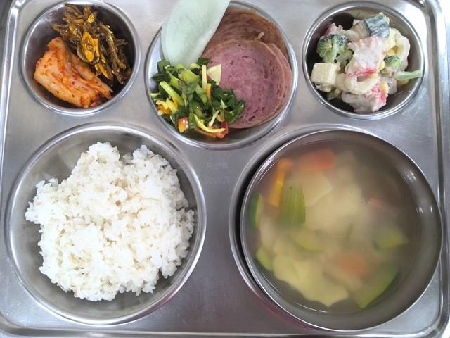 보리밥 이색수제비국 (5.6.9.13.17.18.)훈제쌈오리 (1.2.5.6.)멸치고추장볶음 (5.6.13.14.)배추김치 (9.)브로콜리꽃맛살샐러드 (1.2.4.5.6.8.10.13.18.)