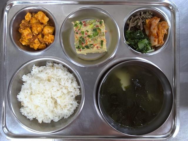 발아현미밥수제비미역국(5.6.8.9.13.17.18.)매콤무항생제달걀찜(1.2.9.)마파두부(5.6.10.12.13.18.)이색나물(단배추고사리)(5.6.)배추김치(9.)* 에너지/단백질/칼슘/철 576.2/29.3/241.7/4.7