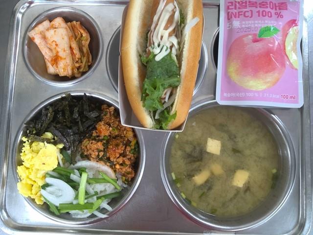 닭고기비빔덮밥(1.5.6.13.15.)미소된장국(5.6.)배추김치(9.)뉴욕식핫도그(1.2.5.6.10.12.13.15.16.18.)복숭아착즙주스(11.)* 에너지/단백질/칼슘/철 867.5/30.5/656.8/5.3