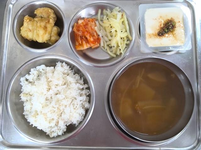 보리밥쇠고기무국(5.6.16.)코다리엿장조림(4.5.6.13.)연두부/양념장(80g)(5.6.13.)감자채볶음(10.)배추김치(9.)* 에너지/단백질/칼슘/철 625.8/34.9/125.8/3.8