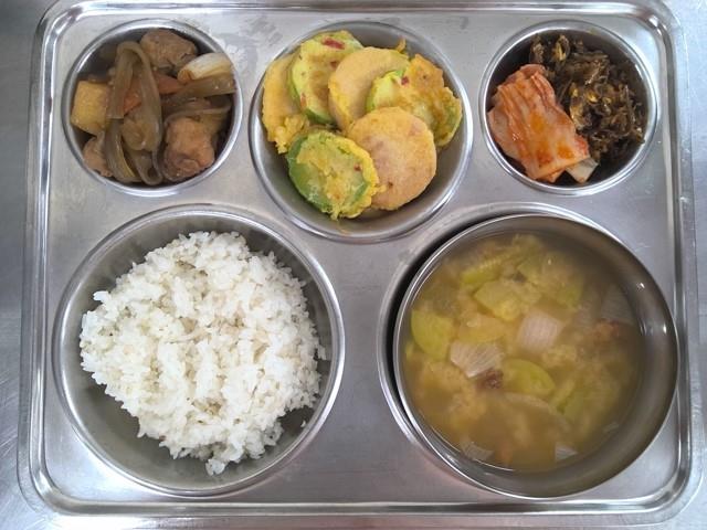 보리밥감자된장국(5.6.18.)안동찜닭(1.5.6.13.15.)애호박햄구이(1.2.5.6.10.15.16.)멸치고추장볶음(5.6.13.14.)배추김치(9.)* 에너지/단백질/칼슘/철 813.8/47.1/336/6.1