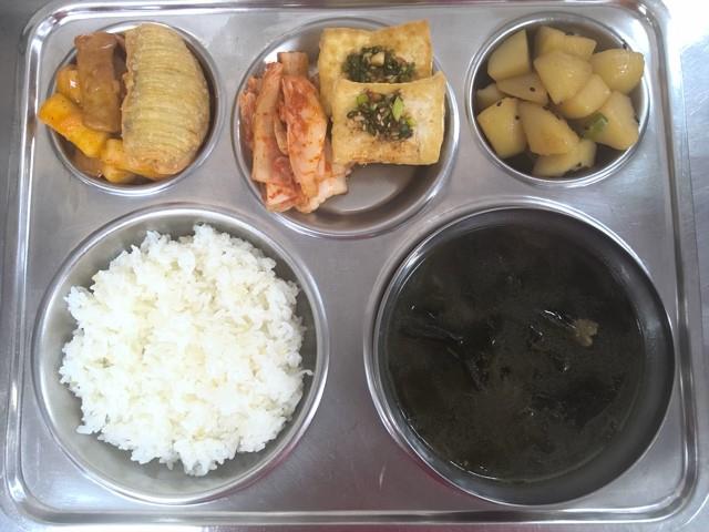 현미찹쌀밥쇠고기미역국(5.6.16.)떡볶음/튀김만두(1.5.6.10.13.16.18.)두부양념구이(5.6.13.)감자조림(5.6.13.)배추김치(9.)* 에너지/단백질/칼슘/철 797.8/29.8/225.7/4.5