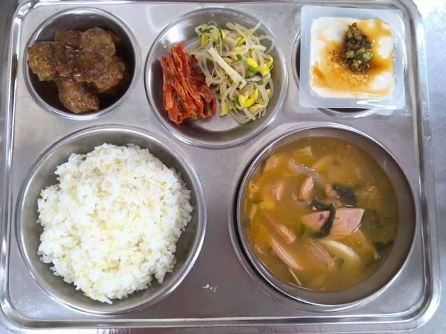 기장밥 부대찌개 (1.2.5.6.9.10.13.15.16)연두부/양념장(80g) (5.6)새송이콩나물무침 (5.6)미트볼찹스테이크 (1.2.5.6.10.12.13.15.16)배추김치 (9)