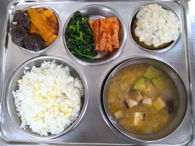 옥수수밥 두부된장국 (5.6.18)시금치나물 (5.6)떡볶음/순대 (1.2.5.6.10.13.16)데리야끼멘츠카츠&어니언크림소스 (1.2.5.6.10.12.13.15.16)배추김치 (9)