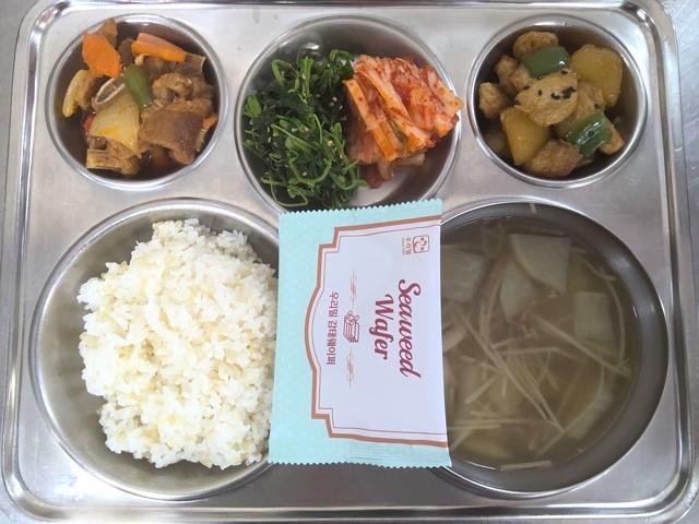 현미찹쌀밥쇠고기맑은국(5.6.16.18)감자어묵조림(1.5.6.13)매운돼지갈비찜(5.6.9.10.13.17.18)비름나물무침(5.6.18)배추김치(9)우리밀 감태웨이퍼(2.5.6)