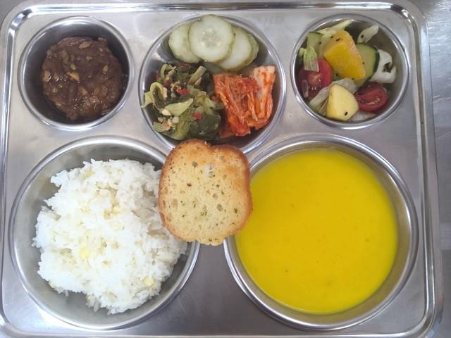 옥수수밥단호박크림스프(2.5.6.13.16)양샹추복숭아샐러드(5.6.11.12)함박스테이크(1.2.5.6.10.12.15.16)우리밀 마늘토스트(2.5.6)오이피클(자율)배추김치(9)단배추조림(자율)(5.6)