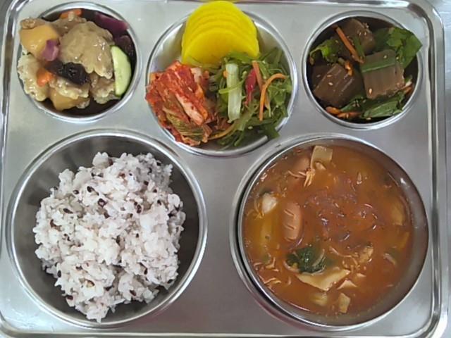 검정찹쌀밥마라탕(1.2.5.6.9.10.13.15.16.17.18)도토리묵야채무침(5.6.13)미역줄기볶음(5.6.18)찹쌀꿔바로우(1.5.6.10.13)반달단무지(자율)배추김치(9)