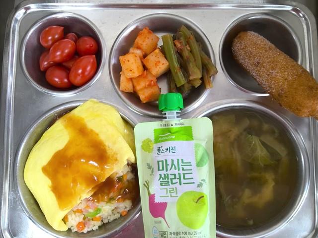 오므라이스(1.2.5.6.10.12.13.15.16.18)단배추시락국(5.6)갓김치(자율)(9)깍두기(9)마시는샐러드(13)방울토마토(12)크리스피핫도그(1.2.5.6.10.12.13.16)