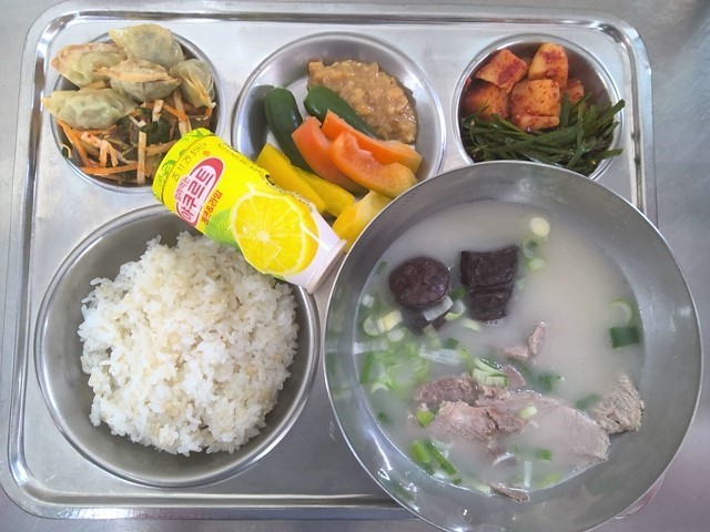 발아현미밥돼지순대국(2.5.6.9.10.13.16)부추겉절이(5.6.13.18)야채비빔만두(1.5.6.10.13.16.18)깍두기(9)레몬&라임맛요구르트(2)고추파프리카/쌈장(자율)(5.6.13)